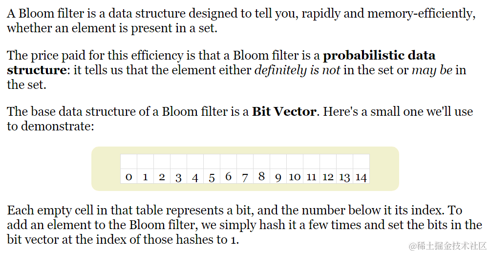 而高效插入和查询的代价就是,Bloom Filter 是一个基于概率的数据结构:它只能告诉我们一个元素绝对不在集合内或可能在集合内。