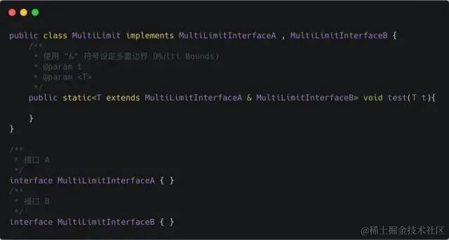 使用 & 符号设定多重边界(Multi Bounds),指定泛型类型 T 必须是 MultiLimitInterfaceA 和 MultiLimitInterfaceB 的共有子类型,此时变量 t 就具有了所有限定的方法和属性。对于通配符来说,因为它不是一个确定的类型,所以不能进行多重限定。