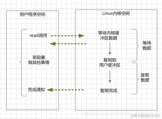 非阻塞IO,指的是用户程序不需要等待内核IO操作完成后,内核立即返回给用户一个状态值,用户空间无需等到内核的IO操作彻底完成,可以立即返回用户空间,执行用户的操作,处于非阻塞的状态。