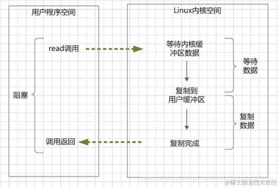在linux中的Java进程中,默认情况下所有的socket都是blocking IO。在阻塞式 I/O 模型中,应用程序在从IO系统调用开始,一直到到系统调用返回,这段时间是阻塞的。返回成功后,应用进程开始处理用户空间的缓存数据。