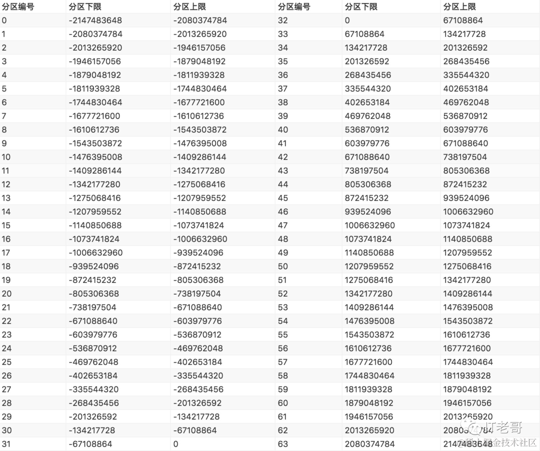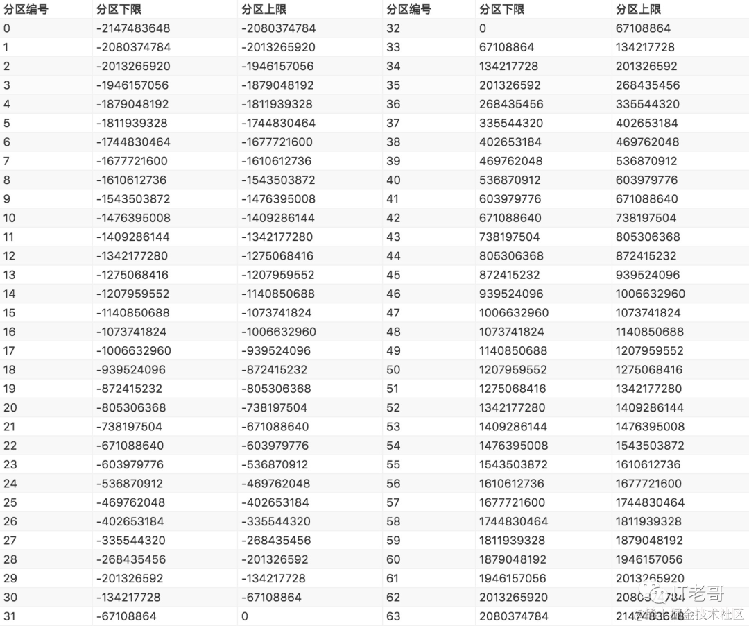本文中的哈希值是用整形表示的,整形的数值区间是 [-2147483648, 2147483647],区间大小为 2^32。所以这里可以将区间等分成64个子区间,每个自子区间大小为 2^26。详细的分区对照表如下:
