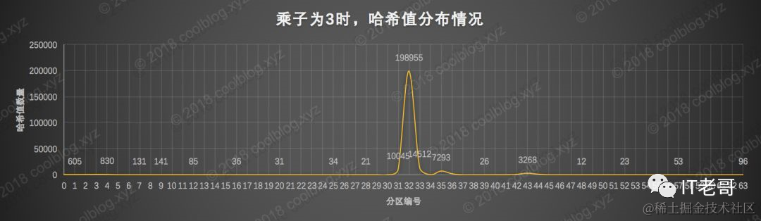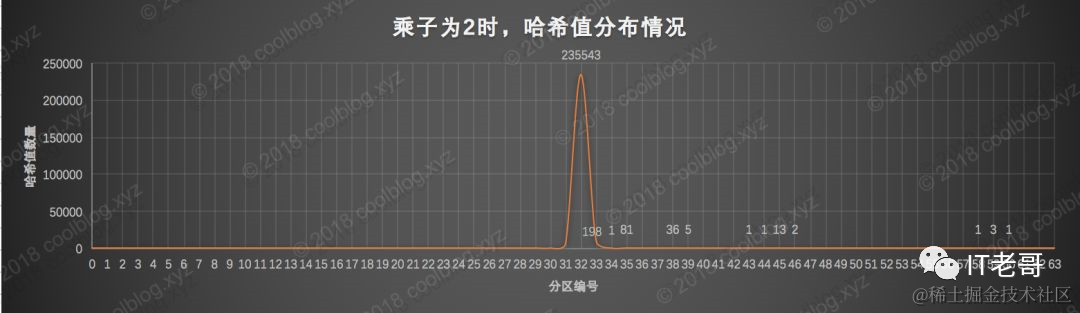 上面的图还是很一目了然的,乘子2算出的哈希值几乎全部落在第32分区,也就是 [0, 67108864)数值区间内,落在其他区间内的哈希值数量几乎可以忽略不计。\