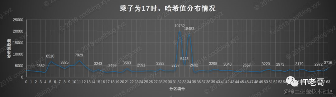 3作为乘子时,算出的哈希值分布情况和2很像,只不过稍微好了那么一点点。从图中可以看出绝大部分的哈希值最终都落在了第32分区里,哈希值的分布性很差。这个也没啥用,拖出去枪毙5分钟吧。在看看数字17的情况怎么样: