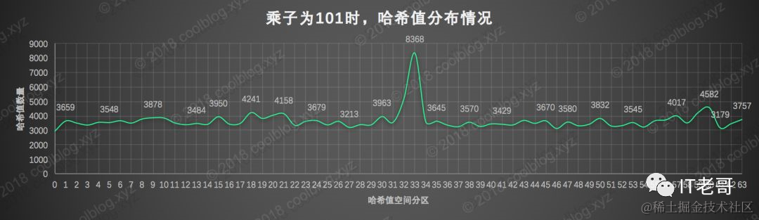 最后再来看看大质数101的表现,不难看出,质数101作为乘子时,算出的哈希值分布情况要好于主角31,有点喧宾夺主的意思。不过不可否认的是,质数101的作为乘子时,哈希值的分布性确实更加均匀。所以如果不在意质数101容易导致数据信息丢失问题,或许其是一个更好的选择。\