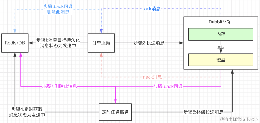 (5)定时任务会作补偿性的投递消息。这个时候如果MQ回调ack成功接收了,再把Redis中此消息删除。