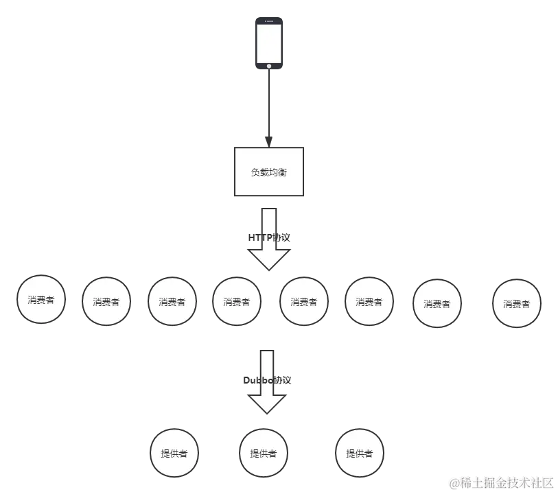 近期在一次生产发布过程中,因为突发的流量,出现了拥堵。系统的部署图如下,客户端通过Http协议访问到Dubbo的消费者,消费者通过Dubbo协议访问服务提供者。这是单个机房,8个消费者3个提供者,共两个机房对外服务。