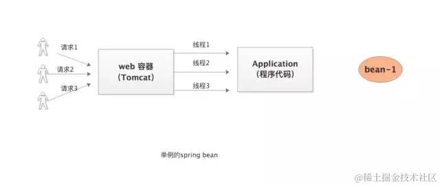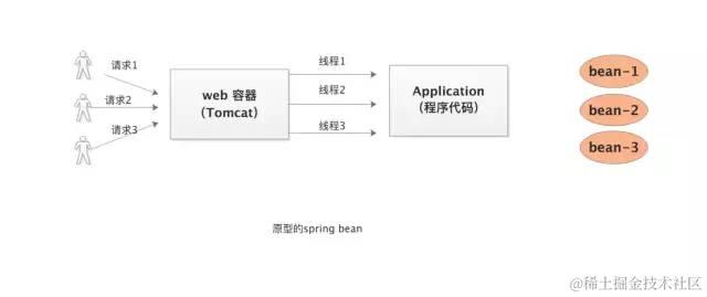 如果一个bean被声明为单例的时候,在处理多次请求的时候在Spring容器里只实例化出一个bean,后续的请求都公用这个对象,这个对象会保存在一个map里面。当有请求来的时候会先从缓存(map)里查看有没有,有的话直接使用这个对象,没有的话才实例化一个新的对象,所以这是个单例的。但是对于原型(prototype)bean来说当每次请求来的时候直接实例化新的bean,没有缓存以及从缓存查的过程。