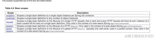 如下图是官方文档上的截图,感兴趣的朋友可以进去看看这五种分别有什么不同。今天要介绍的是这五种中的前两种,也是Spring最初提供的bean scope singleton 和 prototype。