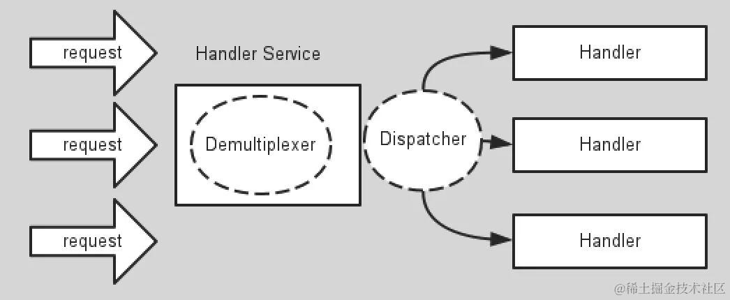 这个Service Handler会同步的将输入的请求多路复用的分发给相应的Request Handler。