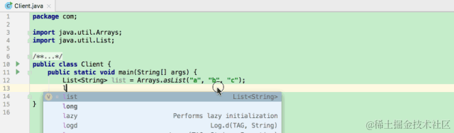 这个功能可以使用代码补全来模板式地补全语句,如遍历循环语句(for、foreach)、使用 String.format() 包裹一个字符串、使用类型转化包裹一个表达式、根据判(非)空或者其它判别语句生成 if 语句、用 instanceOf 生成分支判断语句等。