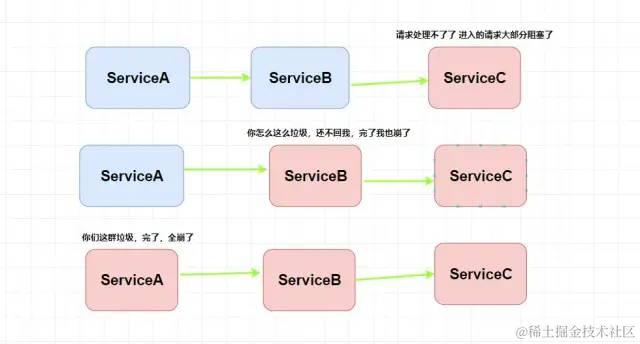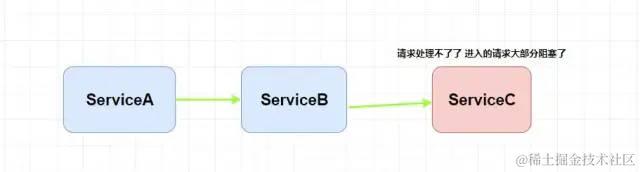 服务C阻塞了还好,毕竟只是一个系统崩溃了。但是请注意这个时候因为服务C不能返回响应,那么服务B调用服务C的的请求就会阻塞,同理服务B阻塞了,那么服务A也会阻塞崩溃。