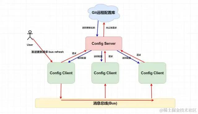 而拥有了 Spring Cloud Bus 之后,我们只需要创建一个简单的请求,并且加上 @ResfreshScope 注解就能进行配置的动态修改了,下面我画了张图供你理解。