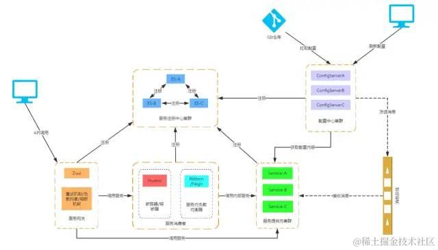 如果你能这个时候能看懂下面那张图,也就说明了你已经对 Spring Cloud 微服务有了一定的架构认识。