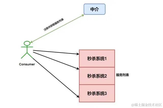 我们再举个????,比如我们设计了一个秒杀系统,但是为了整个系统的 高可用 ,我们需要将这个系统做一个集群,而这个时候我们消费者就可以拥有多个秒杀系统的调用途径了,如下图。