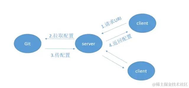 你想一下,我们的应用是不是只有启动的时候才会进行配置文件的加载,那么我们的 Spring Cloud Config 就暴露出一个接口给启动应用来获取它所想要的配置文件,应用获取到配置文件然后再进行它的初始化工作。就如下图。