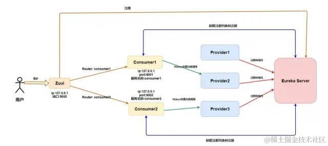 其工作原理就是 Consumer 端获取到了所有的服务列表之后,在其内部使用负载均衡算法,进行对多个系统的调用。