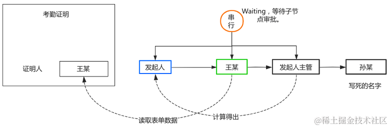 - 第三种:根据发起人和一个映射函数,算出审批人。比如 get_主管("钱某") 得到钱某的主管 李某。