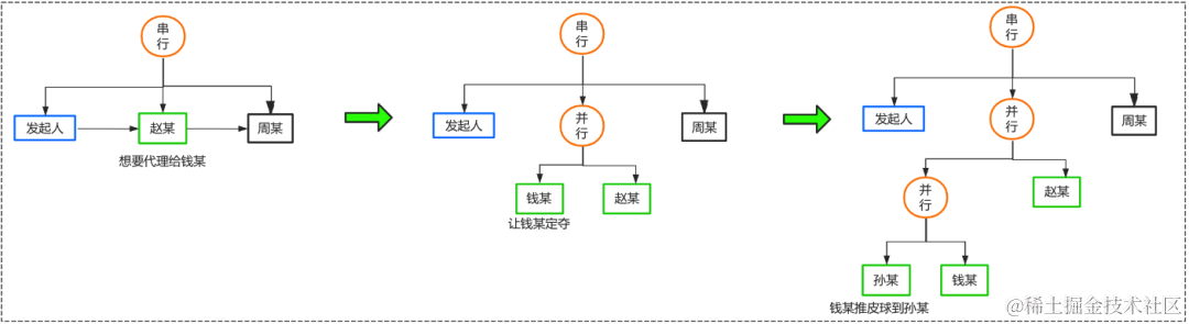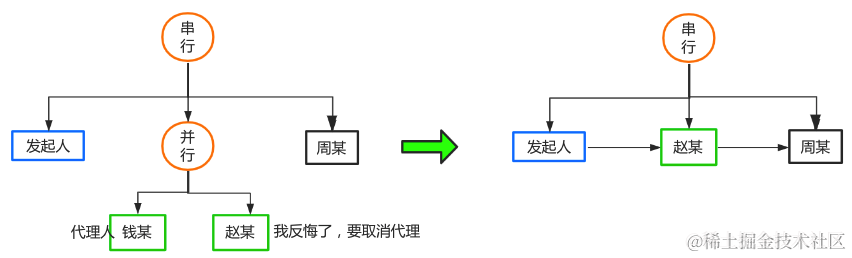 - 代理操作的本质是,新建一个并行节点作为本节点的父节点,再新建一个兄弟节点放代理人,这样自己和代理人都能审批通过。