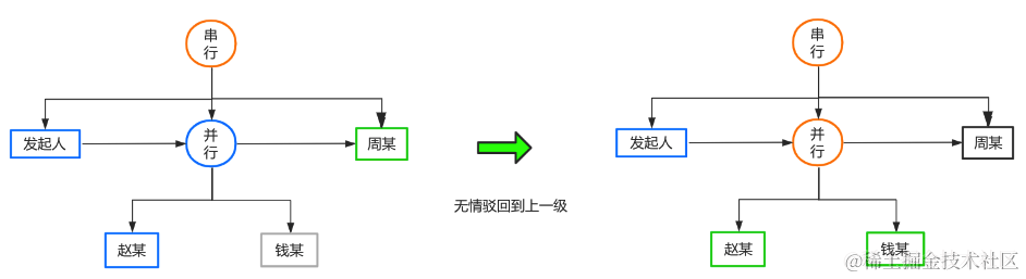 - 不断的驳回上一级,直到Ready状态的节点包含要驳回到的节点为止。