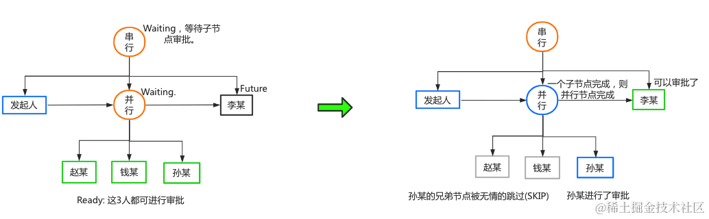 - Waiting: 只有复杂节点有该状态,表示在等待子节点审批。