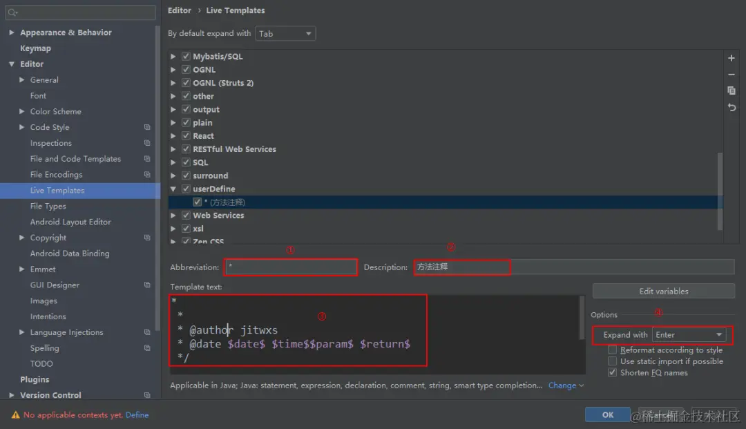 此时就会创建了一个空的模板,我们修改该模板的 Abbreviation、Description 和 Template text。需要注意的是,Abbreviation 必须为 *,最后检查下 Expand with 的值是否为 Enter 键。