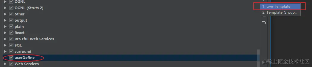 然后选中刚刚创建的模板分组 userDefine,然后点击 +,选择 1. Live Template: