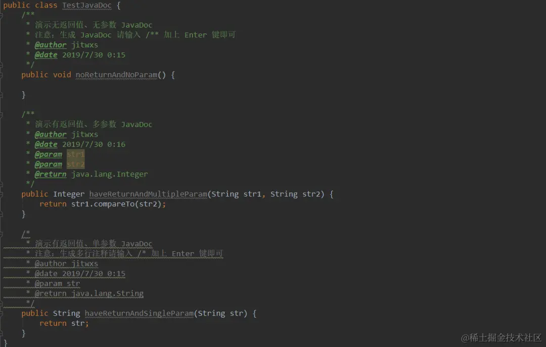 这也同时说明了为什么注释模板首行是一个 * 了,因为当我们先输入 /*,然后输入 * + Enter,触发模板,首行正好拼成了 /**,符合 Javadoc 的规范。