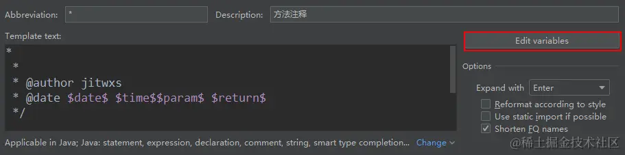 还记得我们配置 Template text 时里面包含了类似于 $date$ 这样的参数,此时 IDEA 还不认识这些参数是啥玩意,下面我们对这些参数进行方法映射,让 IDEA 能够明白这些参数的含义。点击 Edit variables 按钮: