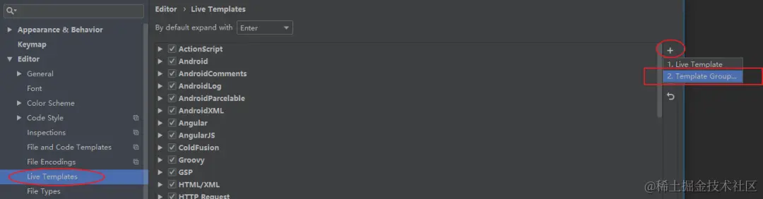 相较于类模板,为方法添加注释模板就较为复杂,首先在 Settings 中点击 Editor-->Live Templates。