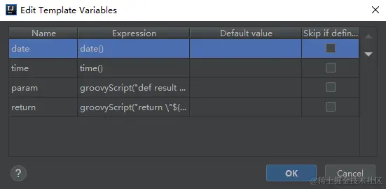 需要注意的是,date 和 time 的 Expression 使用的是 IDEA 内置的函数,直接使用下拉框选择就可以了,而 param 这个参数 IDEA 默认的实现很差,因此我们需要手动实现,代码如下: