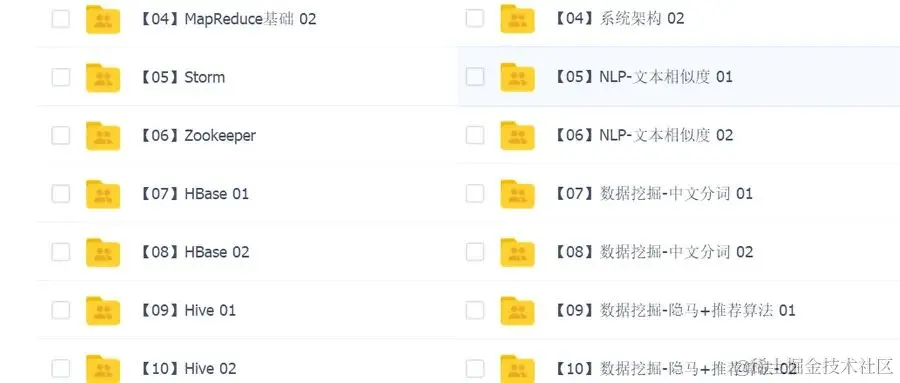 鉴于此,我们团队便打磨一份适合绝大多数人学习的 《大数据架构、机器学习》 的想法,课程内容包含了一线大厂、日常工作使用的技术点,从浅到深,提高你的纵向和横向认知。以下是我罗列的部分内容,文末可全部打包领取 。\