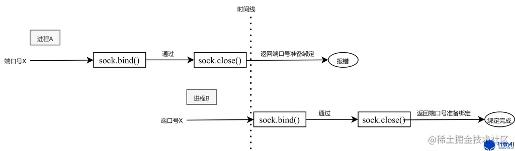 上图所示,同一个端口号X被进程A和进程B查用。对于进程B,查用进度比进程A稍慢,在进程A将端口X释放并准备返回程序进行绑定时,进程B绑定了端口X进行检查,此时进程A将无法再绑定端口X导致报错。