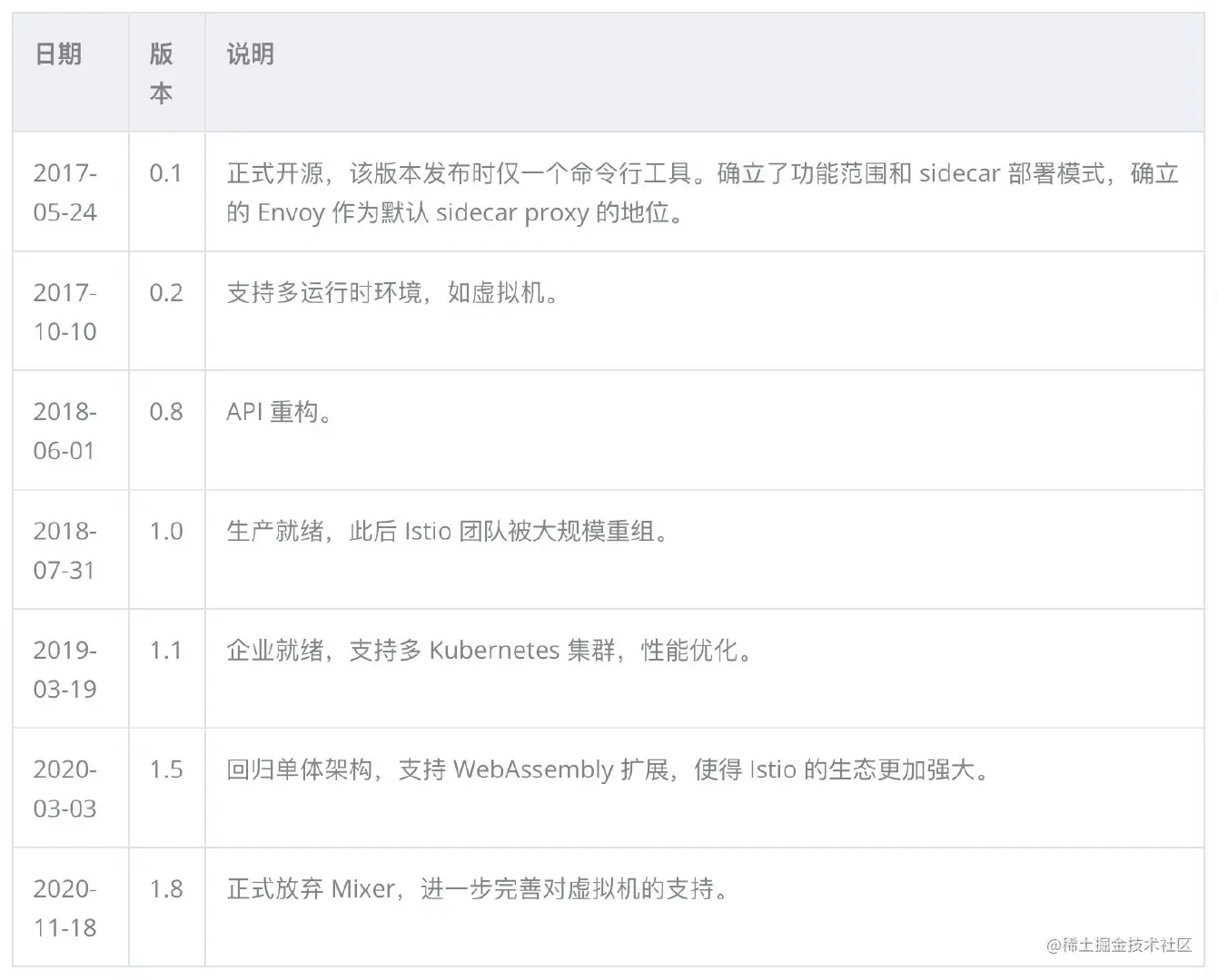 2017 年是 Kubernetes 结束容器编排之战的一年,Google 为了巩固在云原生领域的优势,并弥补 Kubernetes 在服务间流量管理方面的劣势,趁势开源了 Istio。下面是截止目前 Istio 历史上最重要的几次版本发布。
