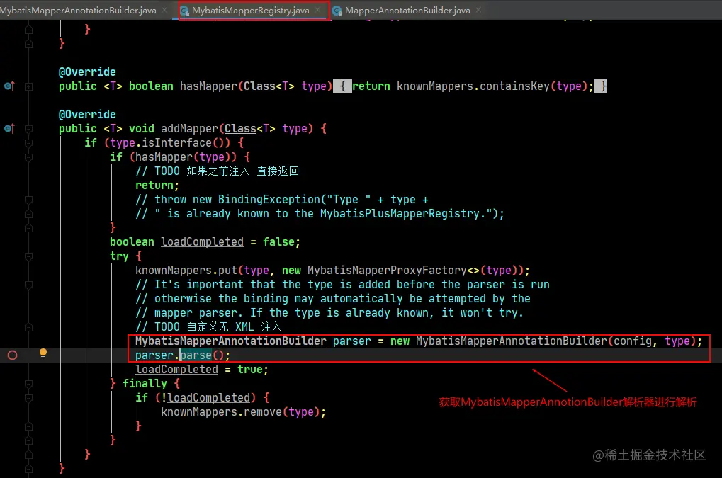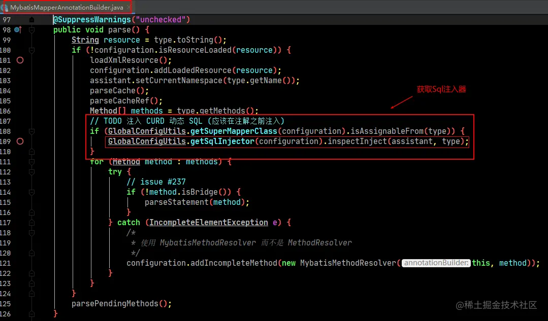 MybatisMapperAnnotationBuilder中的parse方法获取了sqlInjector(Sql注入器)来进行SQL注入。