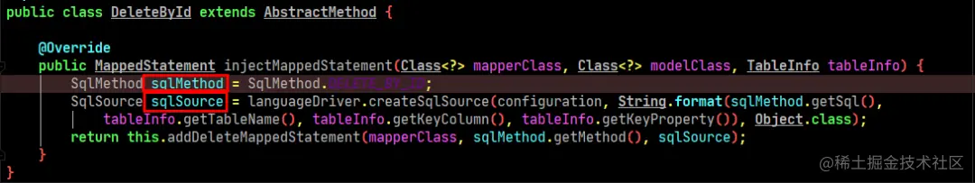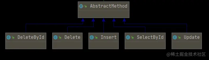 这里我们可以发现,源码中根据不同的方法继承AbstractMethod实现了不同的实现类,并且实现了injectMappedStatement方法,sqlSource也是在这个地方被添加进配置文件。