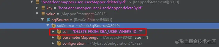此时SqlSource通过解析SQL模板、以及传入的表信息和主键信息构建出了SQL语句。