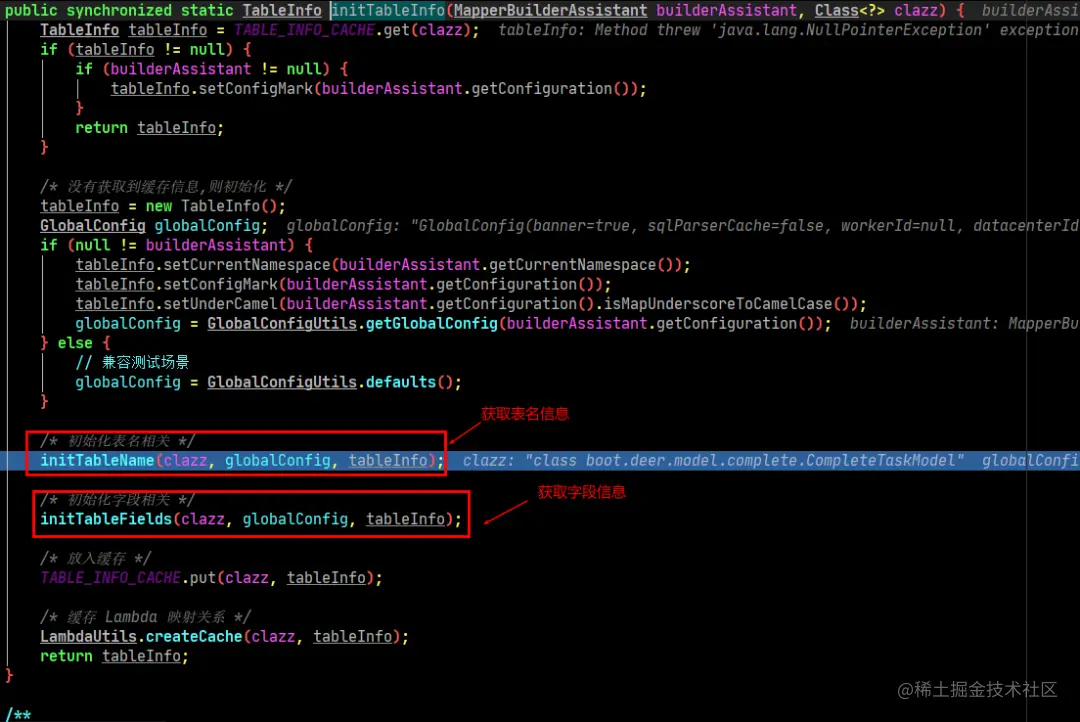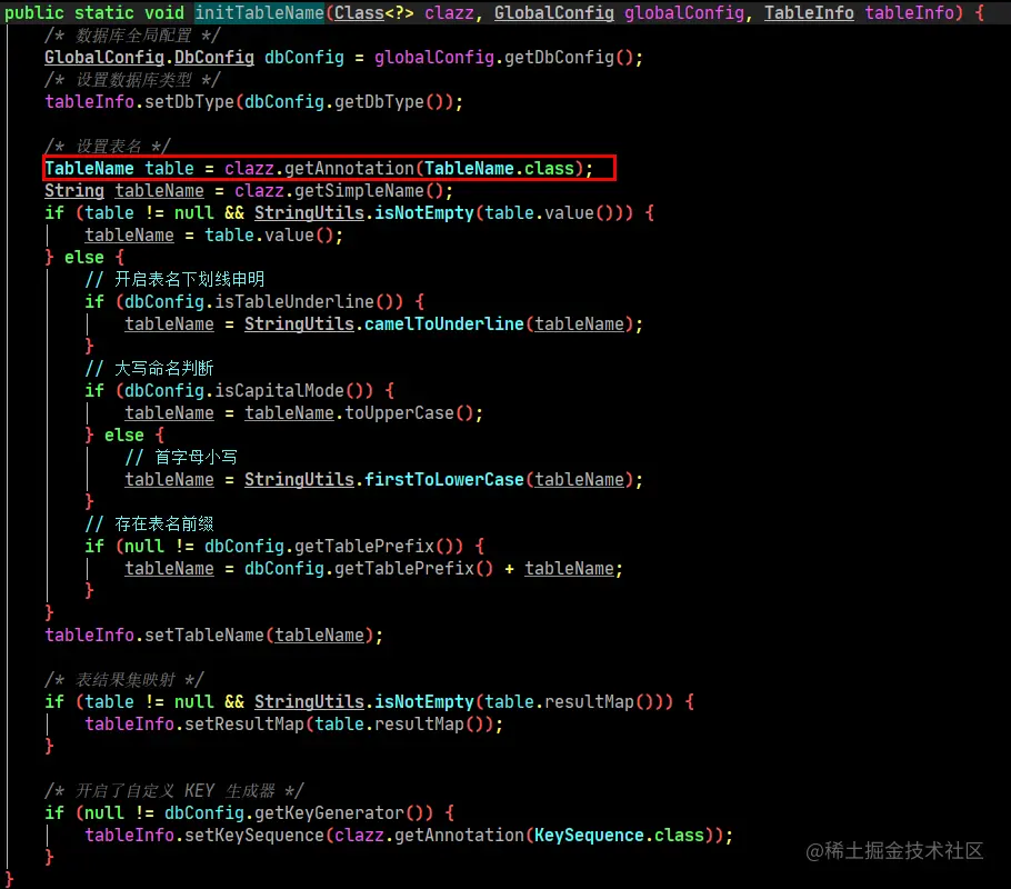 分析initTableName()方法:获取表名信息源码中传入了实体类信息clazz,其实就是通过实体上的@TableName注解拿到了表名;