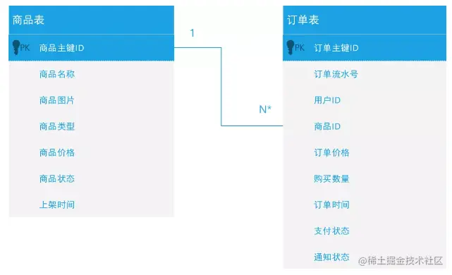 假设有两张表:一张商品表、一张订单表,具体表的字段如下:
