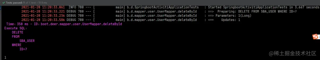 控制台显示:MyBatis-plus最终为我们自动生成了SQL语句。根据上述操作分析:UserMapper继承了BaseMapper,拥有了deleteById的方法,但是MyBatis-plus是基于mybatis的增强版,关键在于最终仍然需要提供具体的SQL语句,来进行数据库操作。