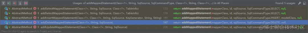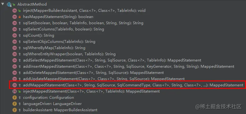基于上面的分析,想要知道SQL语句什么时候拿到的,就是要找到mappedStatement被添加的位置。追踪到AbstractMethod的抽象方法中。