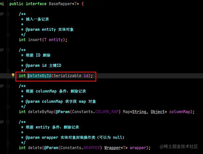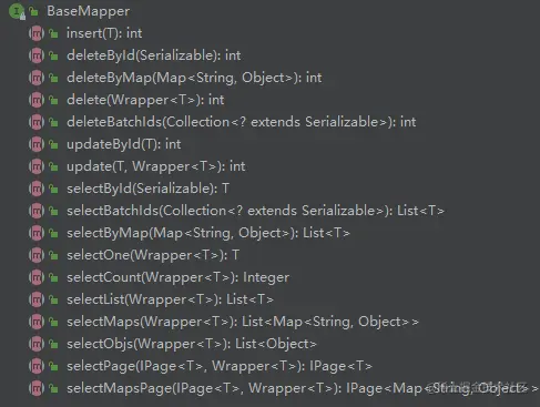 而BaseMapper的所有方法(deleteById、delete、insert、select、update等)都继承了该抽象方法。