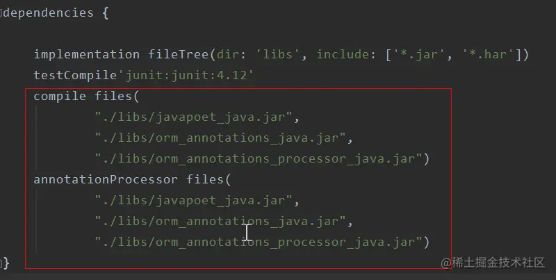 dependencies { compile files("ohos.jar的路径","orm_annotations_java.jar的路径