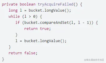 本地限流的实现可以用Long长整型作为令牌桶,为了达到无锁,建议使用Long的原子类型AtomicLong,使用AtomicLong的好处就是可以非常方便的对其进行CAS加操作与CAS减操作(也就是令牌桶令牌的放入与拿取),以避免线程的上下文切换的开销,核心CAS算法如下: