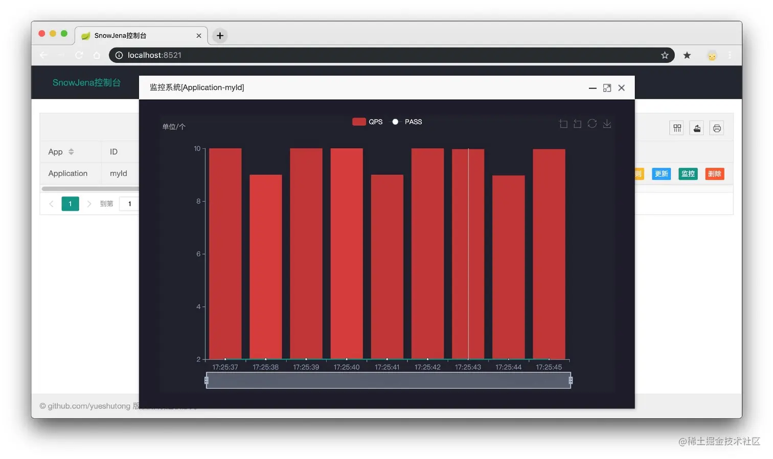 在解决如何对客户端实例的健康状况进行检查时,利用的是Redis的过期时间与客户端发送的心跳包(发送心跳时再进行延期)。比较不错的一点是,该项目提供基于前端Echarts图表的QPS视图展示,如下图。
