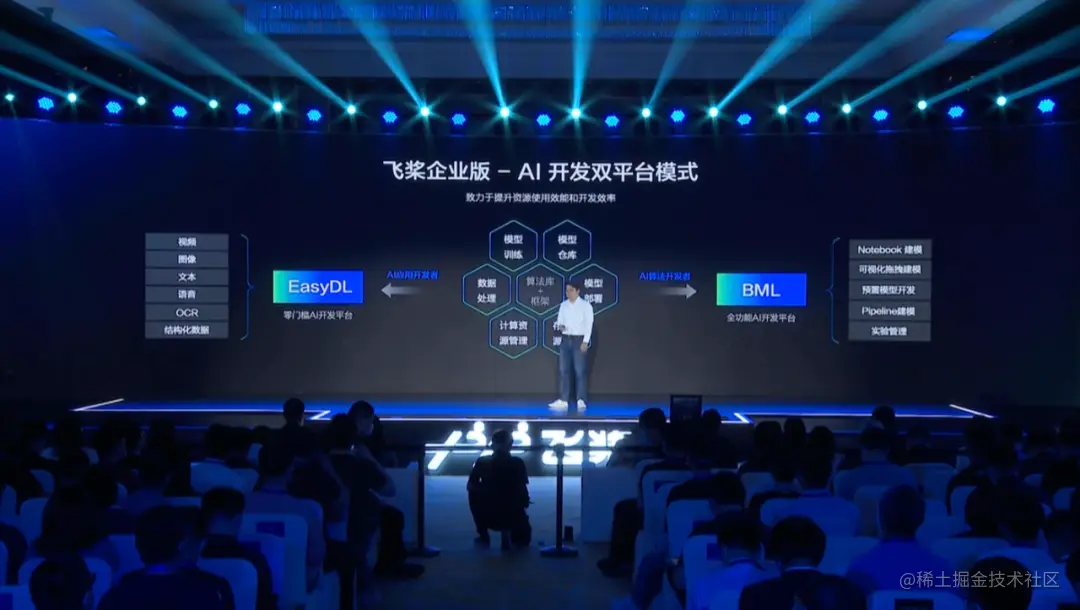 面对各个行业面临的众多场景需求,飞桨企业版采用 AI 开发双平台的形式——EasyDL 零门槛 AI 开发平台和 BML 全功能 AI 开发平台,让不够精通人工智能算法的企业开发者能够像使用家电一样简单的用起 AI,更多的专注于业务场景和创新。另一方面,AI 技术专家也可以更高效地开发出全新技术,并快速进行部署。