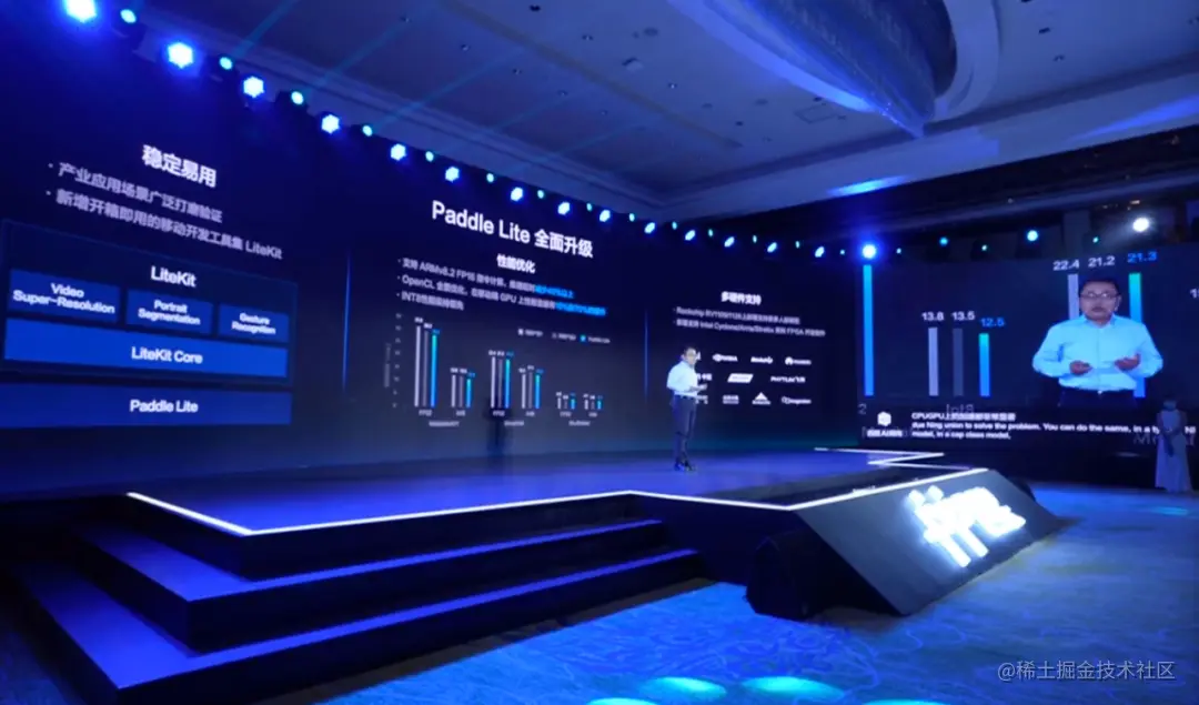 飞桨的轻量化推理引擎 Paddle Lite 也进行了全面升级。近日,百度发布了面向移动开发者的开箱即用工具集 LiteKit,针对移动端开发的特点对 Paddle Lite 进行了封装,显著降低了端侧 AI 开发者的开发成本。此外,Paddle Lite 在 ARM CPU 和 OpenCL 的推理性能也进一步提升,尤其在广泛应用的 INT8 性能持续保持领先。硬件支持方面,Paddle Lite 与包括瑞芯微、Intel FPGA 开发套件在内的硬件的进一步融合适配,满足了更多应用场景的需要。