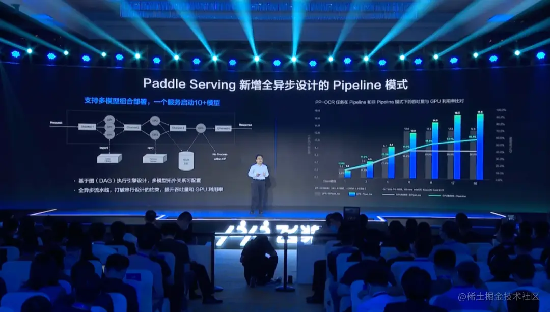 右图是在 PaddleOCR 上的测试数据。可以看到,随着用户访问数量的增加,非 Pipeline 模式无论是吞吐量或 GPU 利用率都很快达到了瓶颈,而 Pipeline 模式依然稳步提升,可有效支持企业的大规模部署需求。