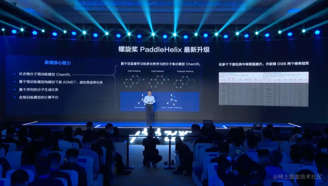 目前,螺旋桨 PaddleHelix 已经升级到了 1.0 正式版本,新增了化合物预训练模型 ChemRL。而且 ChemRL 模型已经应用到了 ADMET、虚拟筛选等下游任务:今年 3 月,在国际权威的图神经网络基准 OGB 的 HIV 和 PCBA 两个药物相关的数据集上,ChemRL 获得双冠军。百度也正式开源了 PaddleHelix(github.com/PaddlePaddl… ),供更多开发者探索使用。