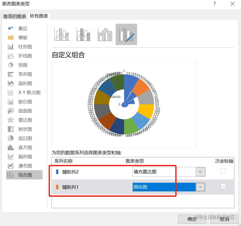 并将复制列1更改为圆环图,圆环图是用来加标签的。