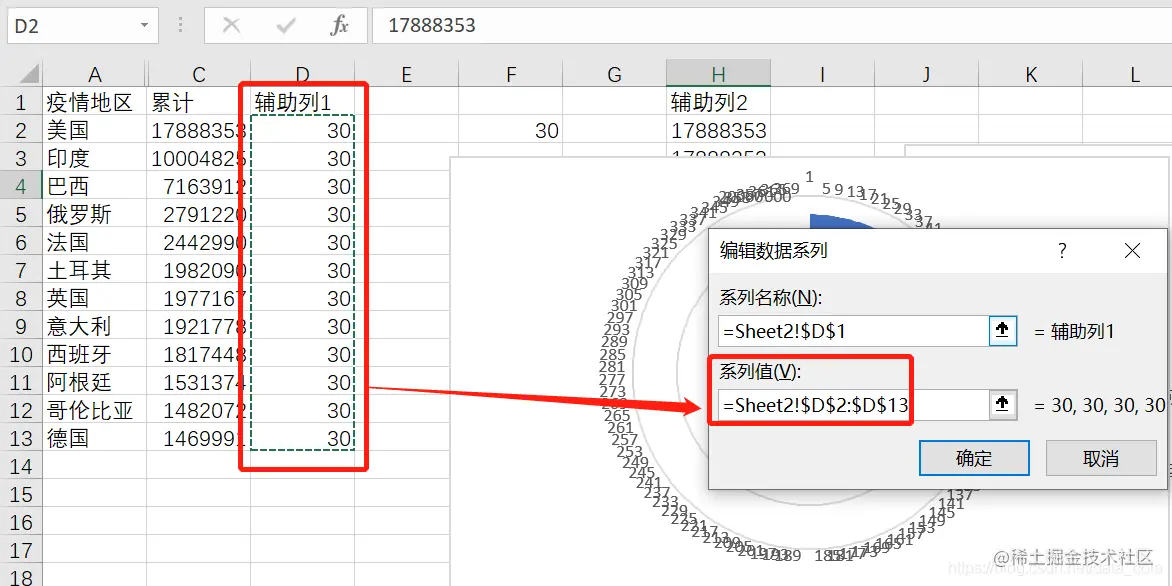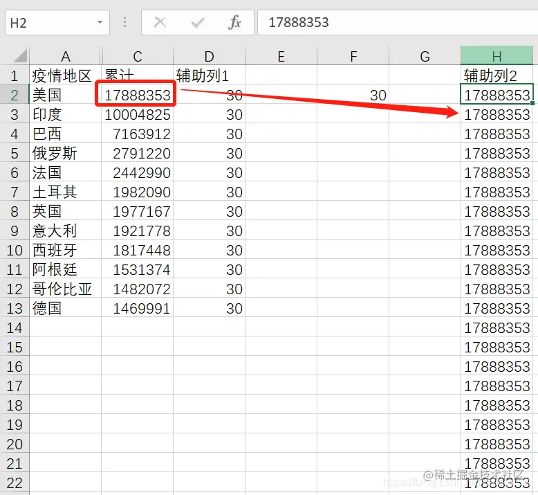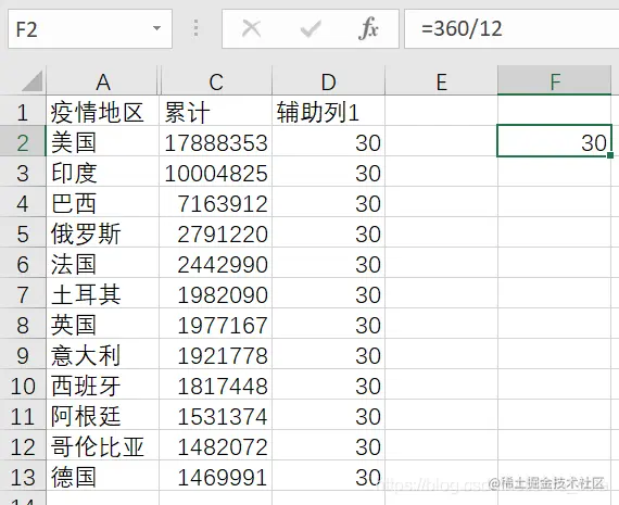 每一个国家后的累计数据复制30次,均复制到辅助列2上,也就是说辅助列2应该有360条数据。
